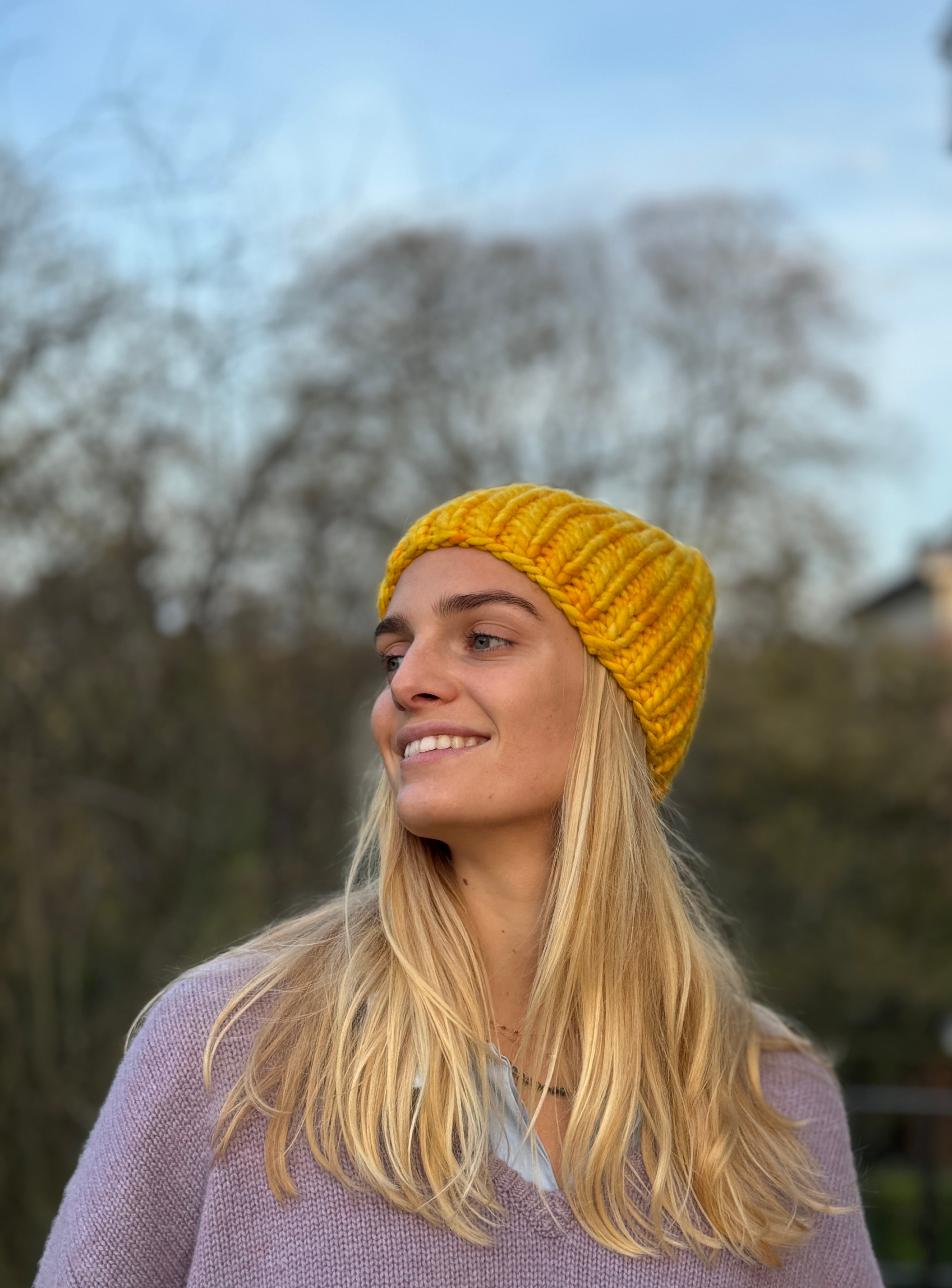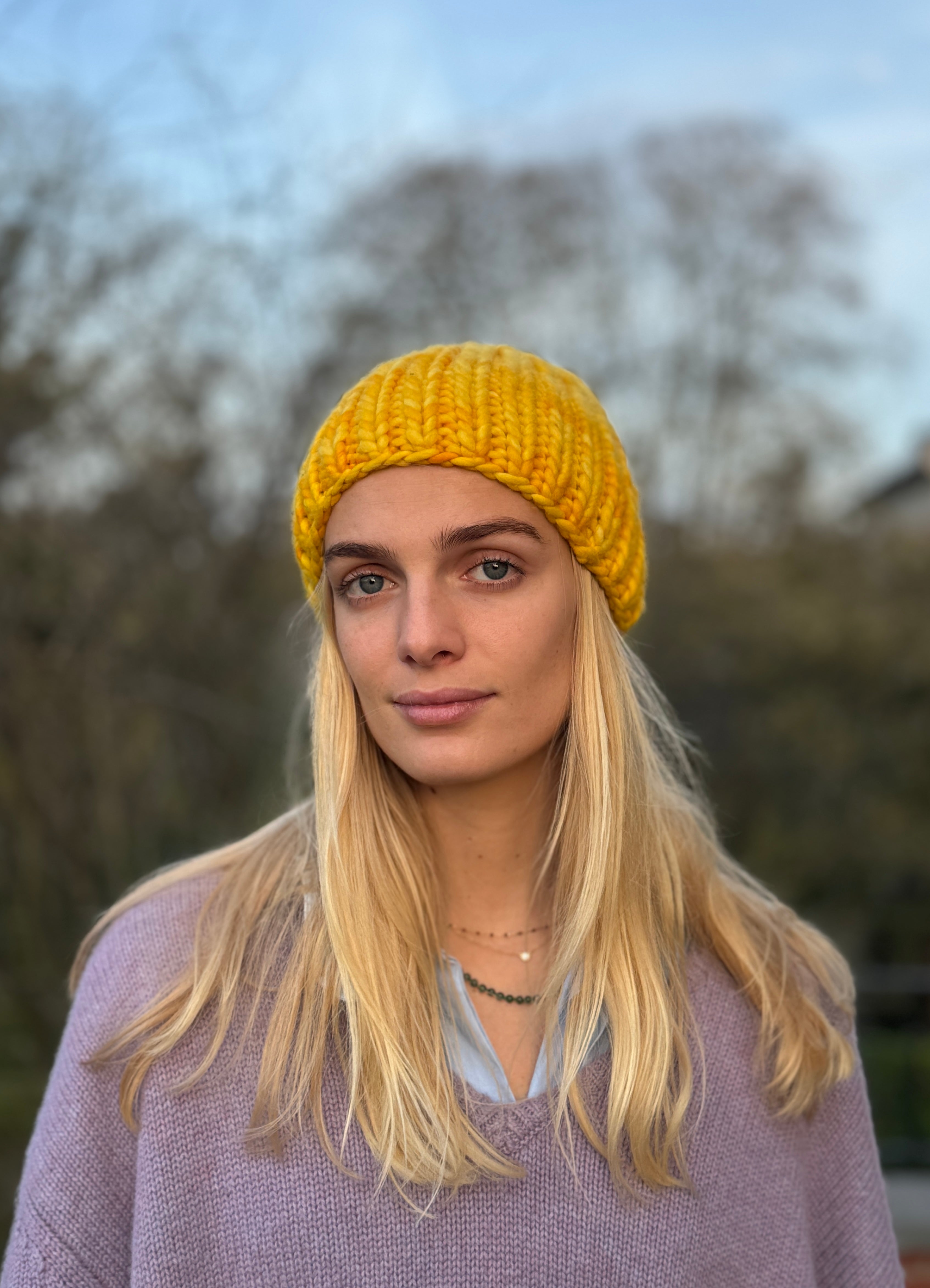 Bonnet Amelia in Citrine is the perfect accessory to brighten up your fall all and winter wardrobe. It is hand-knitted by artisans in Peru from sumptuous 100% natural yarns that are specifically made to order for WEHVE.