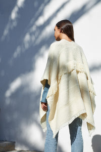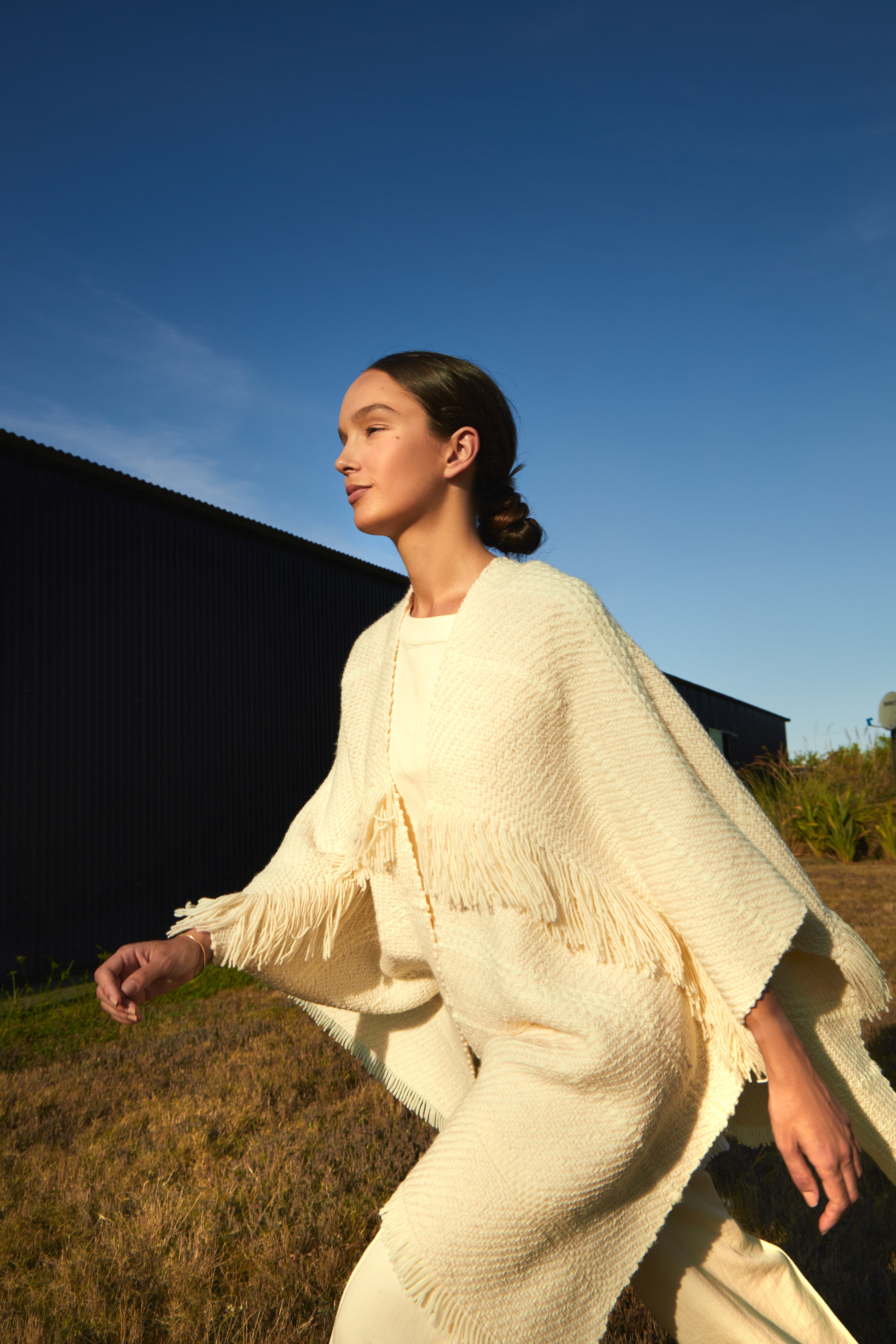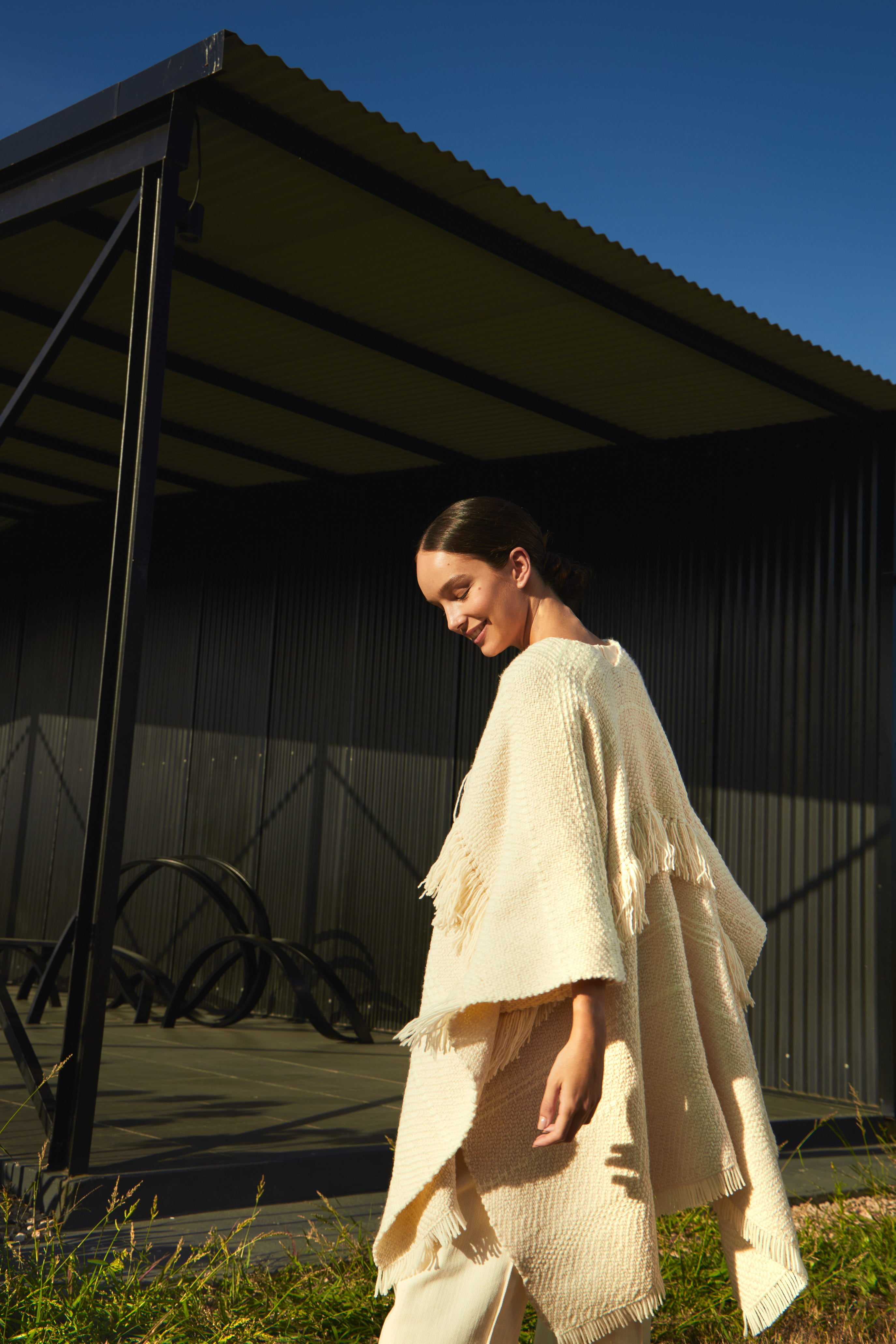 In timeless Ivoire, the Jasmin Cape from WEHVE is a new style, expertly combing fringed shoulders with different weaving techniques.will always be your perfect companion piece. It is handwoven by artisans in Uruguay from sumptuous 100% natural yarns that are specifically made to order for WEHVE. The oversized design is bordered with tonal fringe detailing, the sides are open, the front panel can be worn over the shoulder.